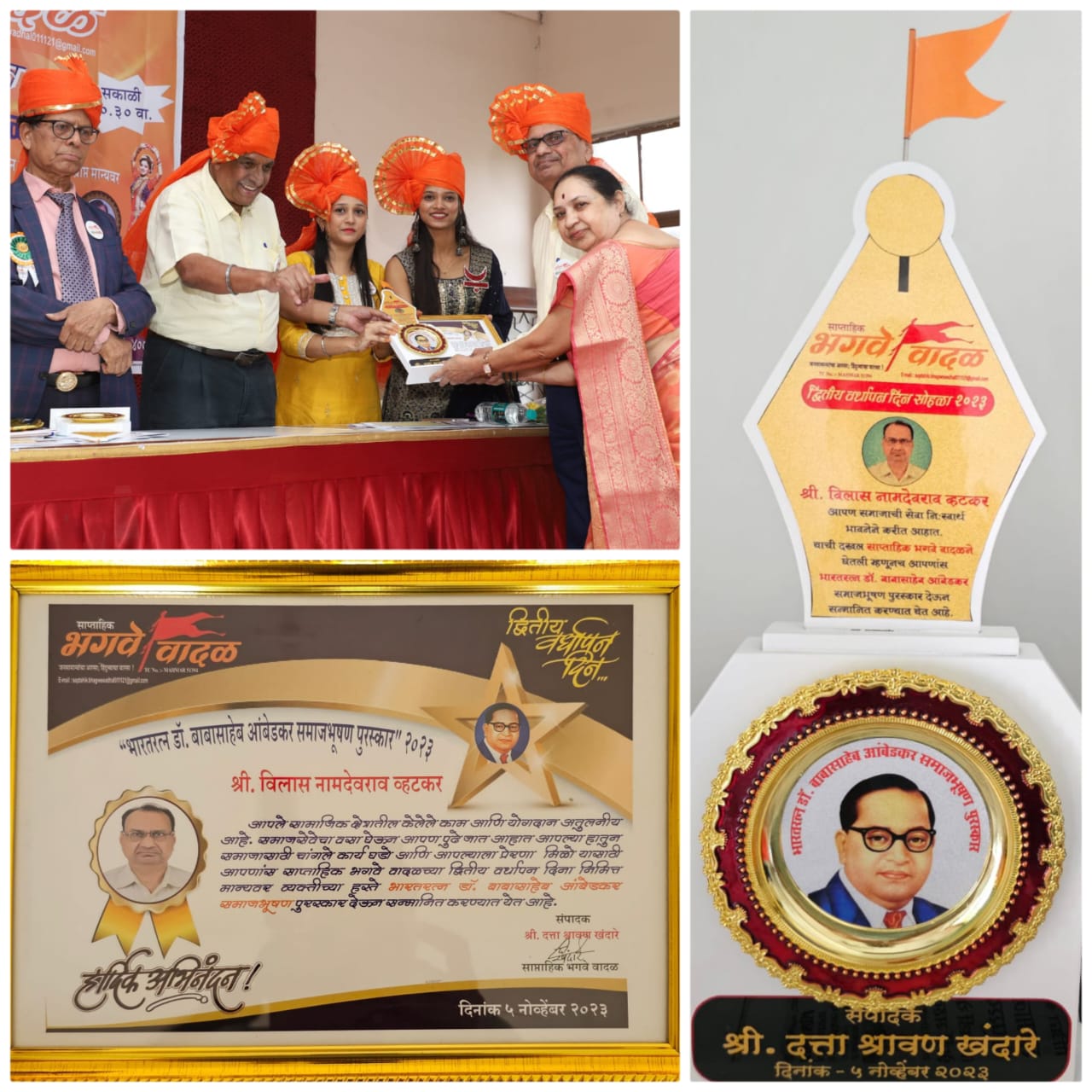 श्री. सुकृत खांडेकर संपादक दैनिक प्रहार यांच्या हस्ते "भारतरत्न डाॅ. बाबासाहेब आंबेडकर समाजभूषण पुरस्कार" प्रदान करण्यात आला. विलास व्हटकर यांनी सपत्नीक पुरस्कार स्वीकारला.